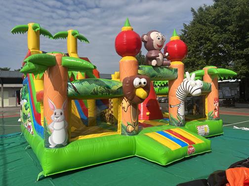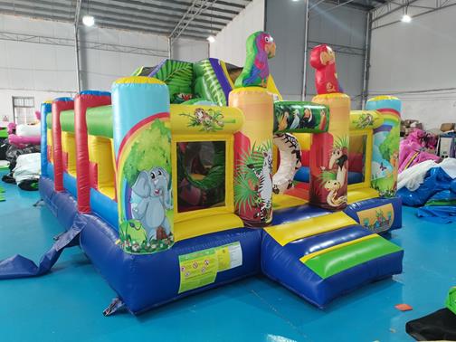 Vodeni tobogan na naduvavanje , s lestvama za penjanje s leve i toboganom s desne strane, štitnikom za mali bazen na dnu za odvod vode i 3D dizajnom palme sa sigurnosnom mrežom na dnu za sigurnost dece tokom igre. Vodeni tobogan u džungli na naduvavanje dolazi sa crtanim slikama životinja iz filma Rio Adventure kako…Igraonica na naduvavanje Tigar i Prašuma